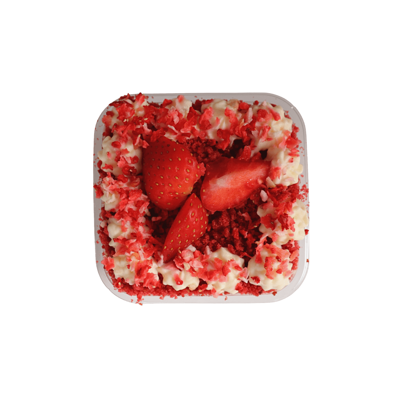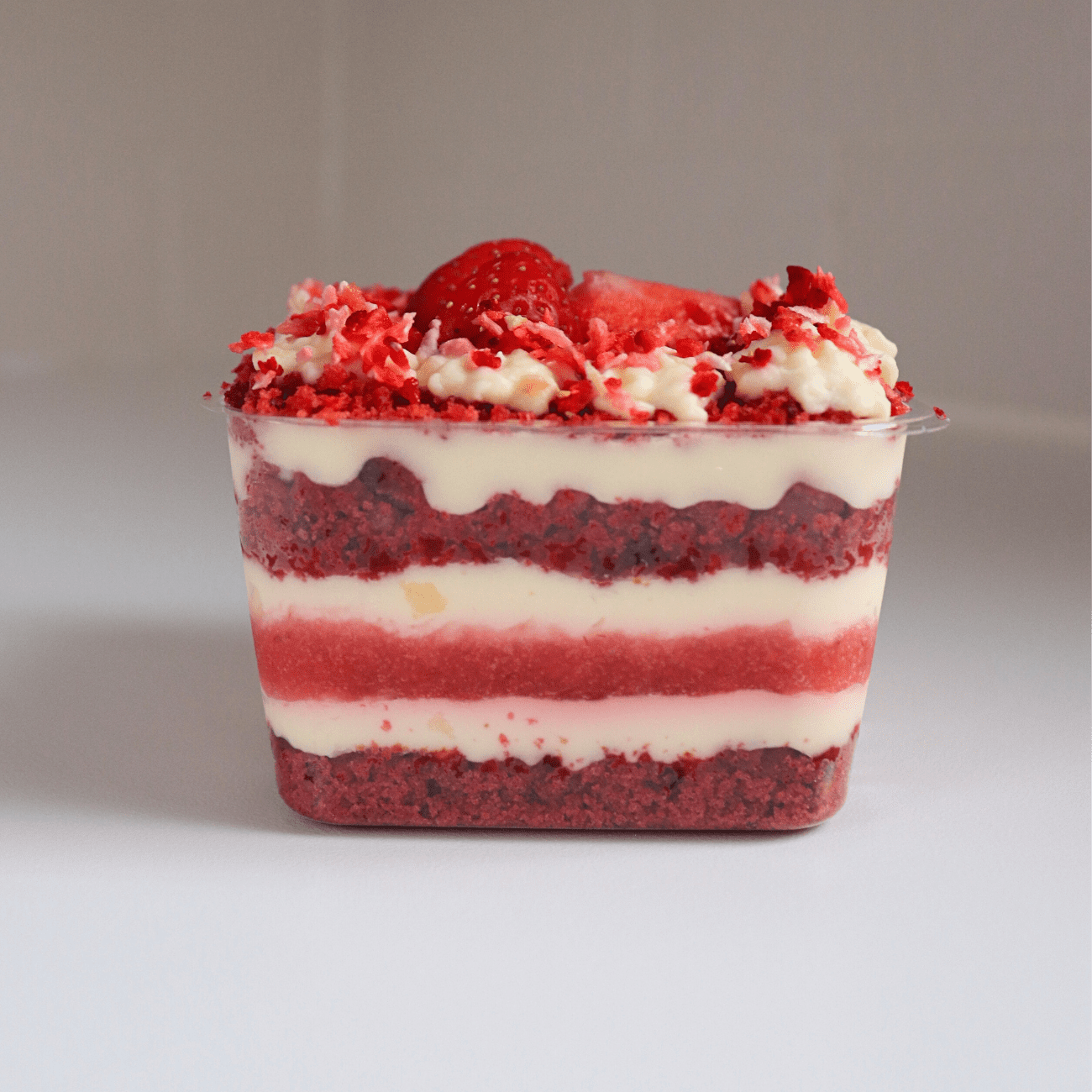 If you love classic Red Velvet with its soft texture, creamy layers, and gentle cocoa notes, our Red Velvet mini layered cakes are the perfect treat. Made fresh in our Edinburgh home kitchen, each dessert features a moist red sponge, a bright strawberry layer, and a silky cream cheese filling. The combination of soft sponge, fresh strawberry filling, and a silky cream cheese layer creates a rich but balanced dessert with the signature flavour of classic Red Velvet.