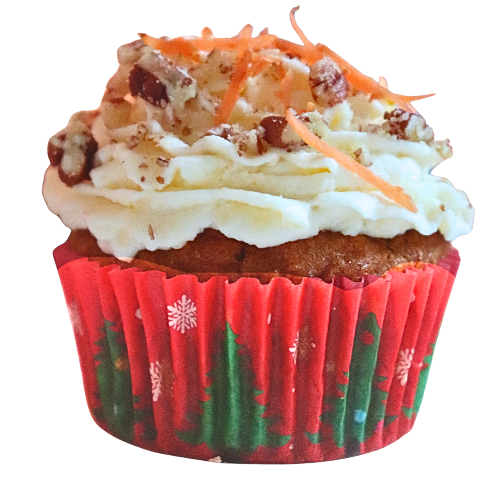 Each cupcake is topped with a smooth cream cheese frosting made from: cream cheese vanilla extract double cream icing sugar, finely chopped nuts or chocolate on top. The frosting is velvety and perfectly balanced — never too sweet, always creamy and fresh.